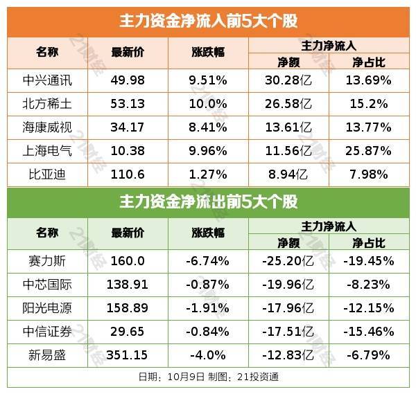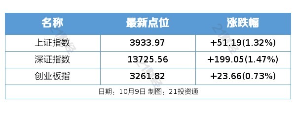 10月9日,A股三大指数今日集体上涨,截至收盘,上证指数涨1.32%,深证成指涨1.47%,创业板指冲高回落涨0.73%,北证50跌0.18%。沪深京三市全天成交额26718亿元,较上日放量4746亿元。全市场超3100只个股上涨。板块题材上,贵金属、可控核聚变、稀土永磁、能源金属、风电设备、钢铁、存储芯片板块涨幅居前;影视院线、旅游及酒店、白酒、免税店板块跌幅居前。