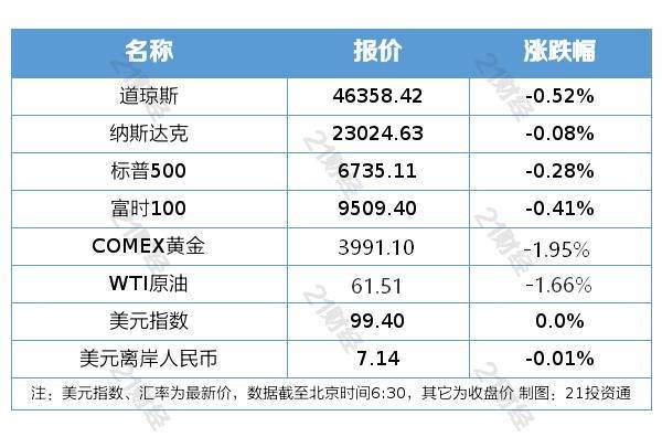 纽约股市三大股指10月9日下跌。截至当天收盘,道琼斯工业平均指数比前一交易日下跌243.36点,收于46358.42点,跌幅为0.52%;标准普尔500种股票指数下跌18.61点,收于6735.11点,跌幅为0.28%;纳斯达克综合指数下跌18.75点,收于23024.63点,跌幅为0.08%。